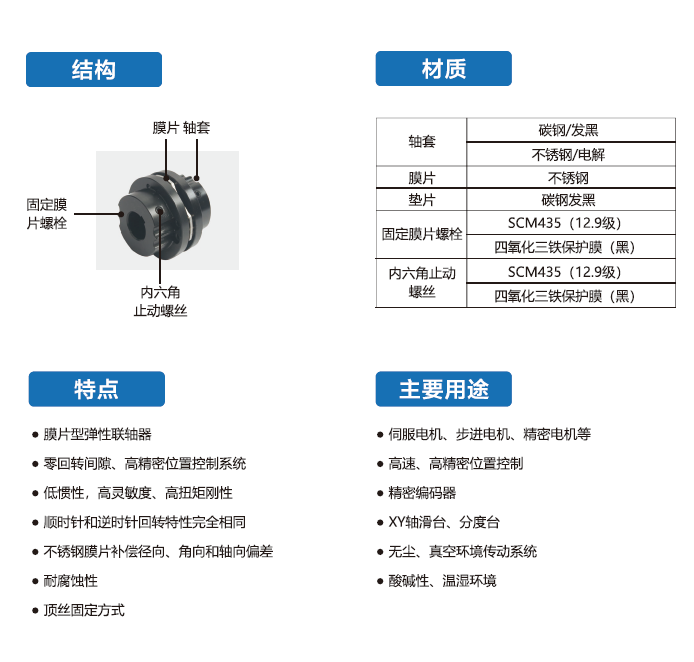 DFPS-G系列聯(lián)軸器采用碳鋼發(fā)黑,利用脹緊套聯(lián)接的膜片型彈性聯(lián)軸器,廣泛用于伺服電機(jī)、步進(jìn)電機(jī)、精密電機(jī)等。