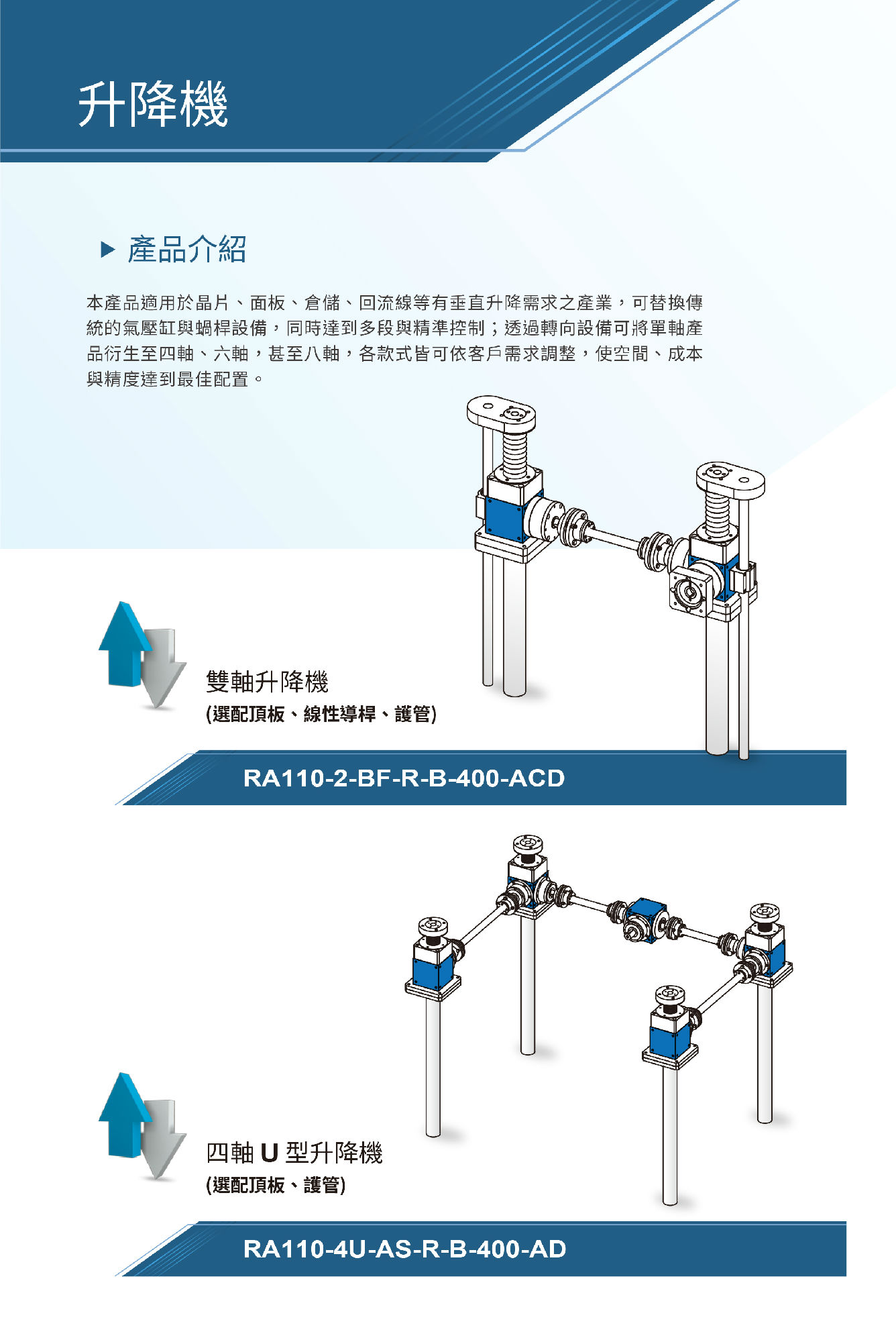 2BF系列雙軸升降機(jī)可選配頂板。適用于晶片、面板、倉儲(chǔ)、回流線等有垂直升降需求的產(chǎn)業(yè),可替換傳統(tǒng)的氣壓罐與蝸桿設(shè)備,同時(shí)達(dá)到多段與精準(zhǔn)控制。