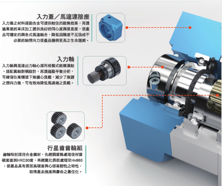 由一個內(nèi)齒環(huán)(A)緊密結(jié)合於齒箱殼體上,環(huán)齒中心有一個自外部動力所驅(qū)動之太陽齒輪(B),介於兩者之間有一組由三顆齒輪等分組合於托盤上之行星齒輪組(C)該組行星齒輪依靠著出力軸、內(nèi)齒環(huán)及太陽齒支撐浮游於期間;行星減速機當(dāng)入力側(cè)動力驅(qū)動太陽齒時,可帶動行星齒輪自轉(zhuǎn),并依循著內(nèi)齒環(huán)之軌跡沿著中心公轉(zhuǎn),游星之旋轉(zhuǎn)帶動連結(jié)於托盤之出力軸輸出動力。