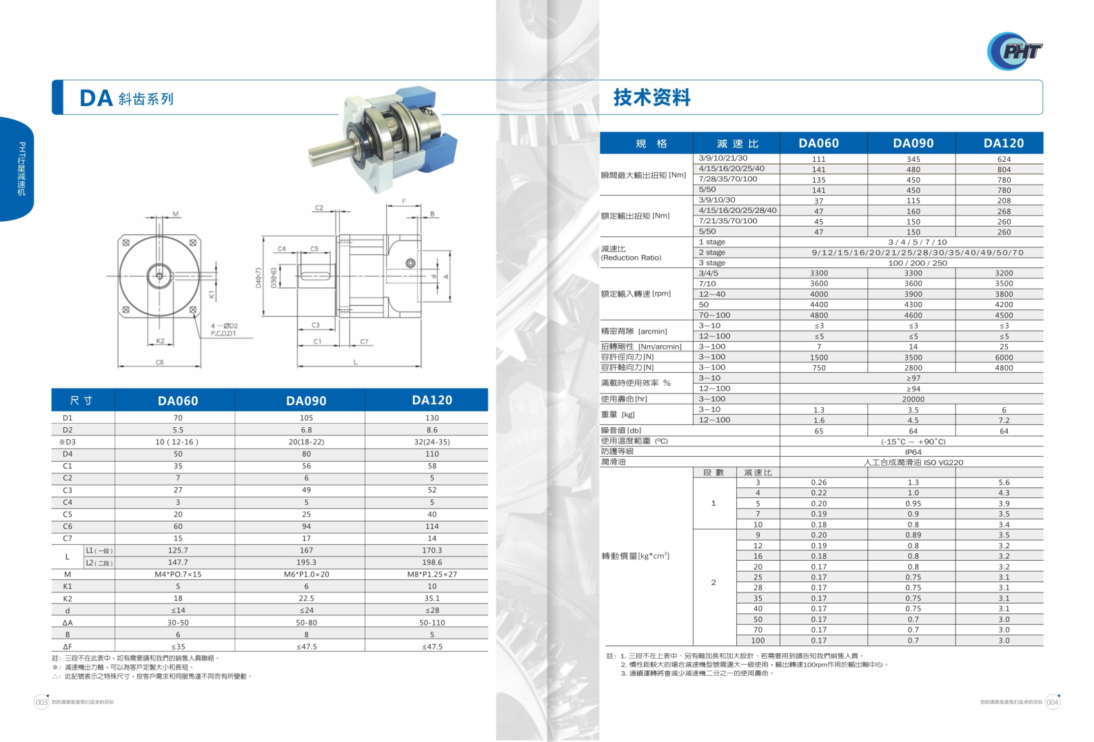 DA 系列是斜齒輪高精度減速機(jī)。 品宏減速機(jī)的軸承是用NSK品牌的,齒輪經(jīng)過碳化,故精度和剛性都比較優(yōu)越!減速機(jī)出力軸是可根據(jù)客戶的要求去定制大小和長短的。
