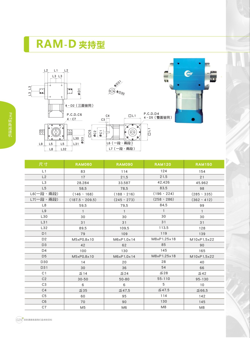 RAM-D系列是夾持型設(shè)計。 鋁合金材質(zhì)可提高散熱能力,減緩溫升現(xiàn)象造成影響。 多樣化的出力軸可因應(yīng)各種場合,客制化的入力端可搭配各式馬達。 提供各式特色之減速機,供使用者依需求選購。 特殊油封設(shè)計,正常使用下不需保養(yǎng)亦不用更換潤滑油,可延長使用壽命。 各式特色,體積小,省空間,噪音低,輸出扭矩高,安裝容易,可搭配馬達型號廣泛。 RAM搭配DM,一體成型的齒輪組,可有效的減低噪音。 RAM搭配DH,最佳的性價比,可廣泛應(yīng)用于各種場合。