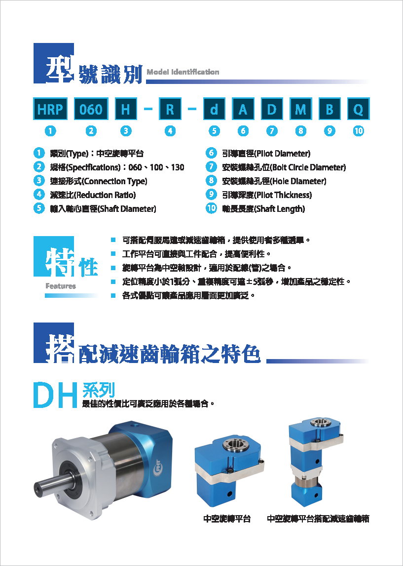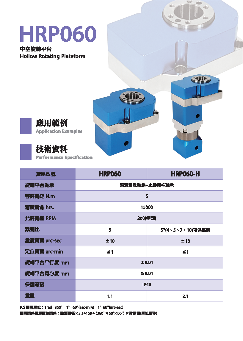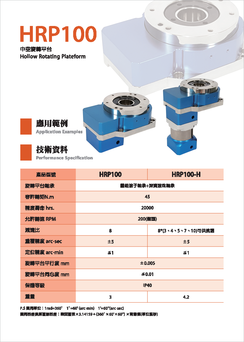 HRP系列是品宏轉(zhuǎn)角減速機(jī)系列。 可搭配伺服馬達(dá)或減速齒輪箱,提供使用者多種選擇。 工作平臺可直接與工件配合,提高便利性。 旋轉(zhuǎn)平臺為中空軸設(shè)計,適用于配管之場合。 定位精度小于1弧分,重復(fù)精度可達(dá)±5弧秒,增加產(chǎn)品之穩(wěn)定性。 各式優(yōu)點可讓產(chǎn)品應(yīng)用層面更加廣泛。