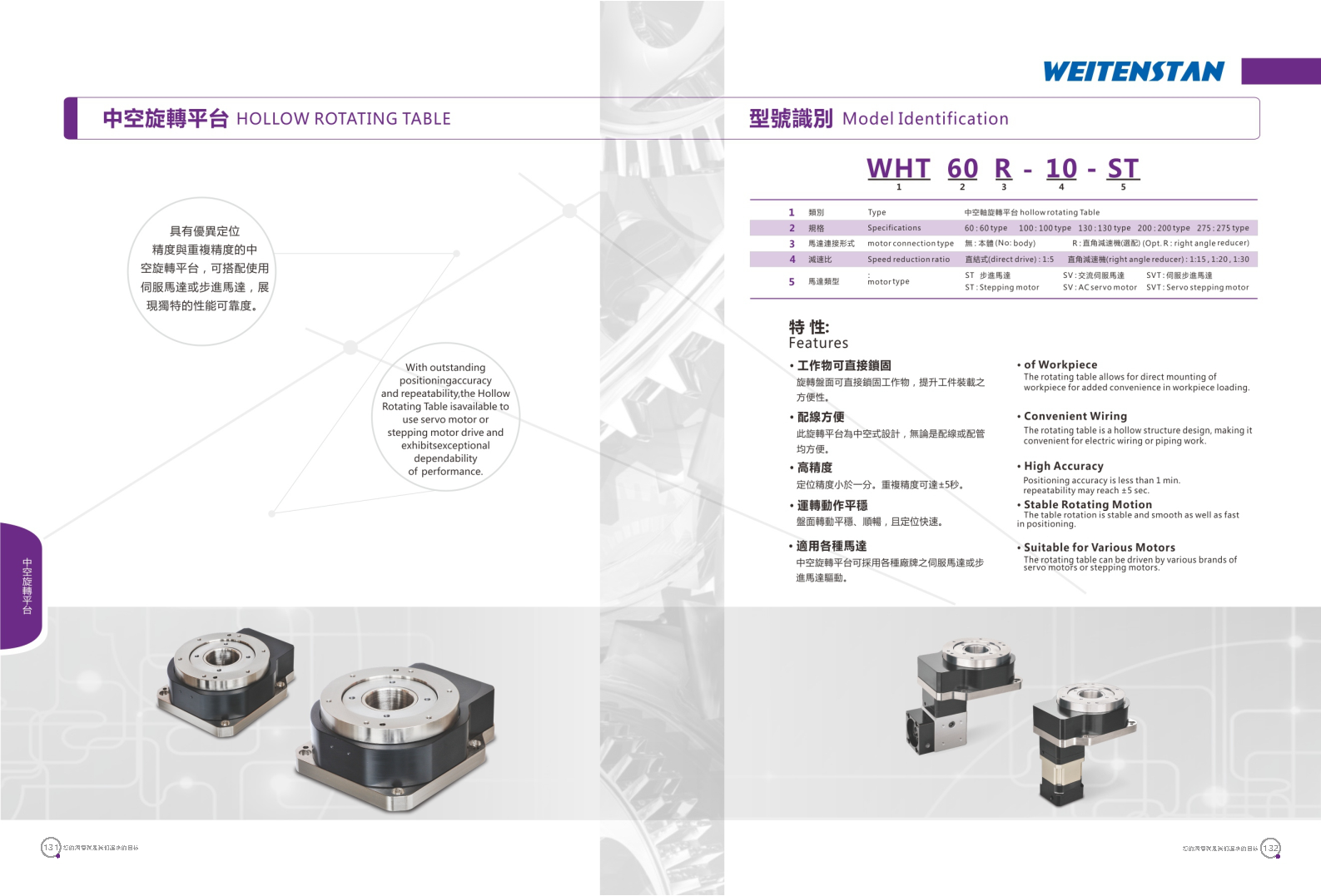 WHT系列中空旋轉(zhuǎn)平臺。 具有優(yōu)異定位精度與重復(fù)精度的中空旋轉(zhuǎn)平臺,可搭配使用伺服馬達或步進馬達,展現(xiàn)獨特的性能可靠度。 工作物可直接鎖固。旋轉(zhuǎn)盤面可直接鎖固工作物,提升工件裝載之方便性。 配線方便。此旋轉(zhuǎn)平臺為中空式設(shè)計,無論是配線或配管均方便。 高精度。定位精度小于1分。重復(fù)精度可達±5秒。 運轉(zhuǎn)動作平穩(wěn)。盤面轉(zhuǎn)動平穩(wěn),順暢,且定位快速。 適用各種馬達。中空旋轉(zhuǎn)平臺可采用各種廠牌之伺服馬達或步進馬達驅(qū)動。