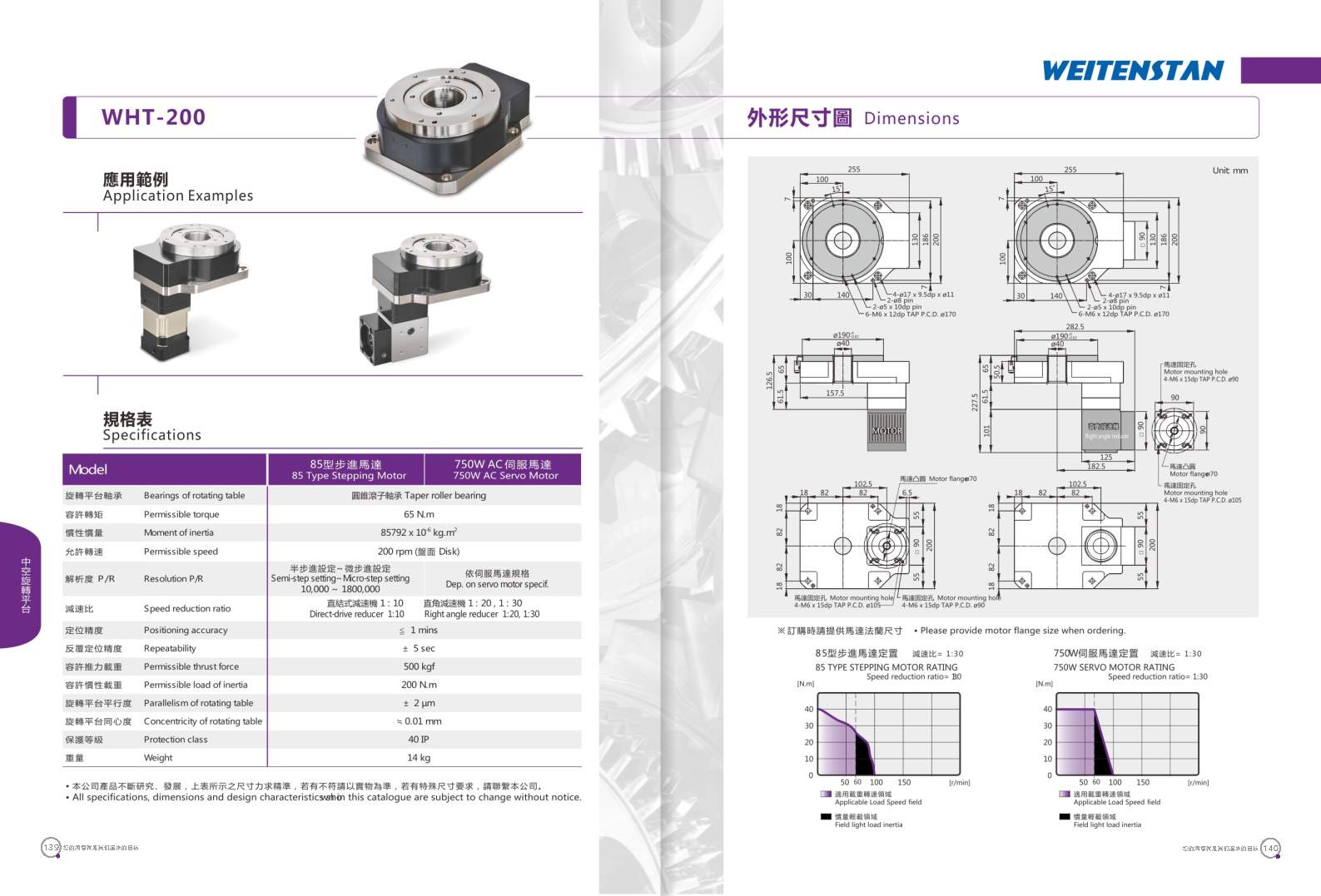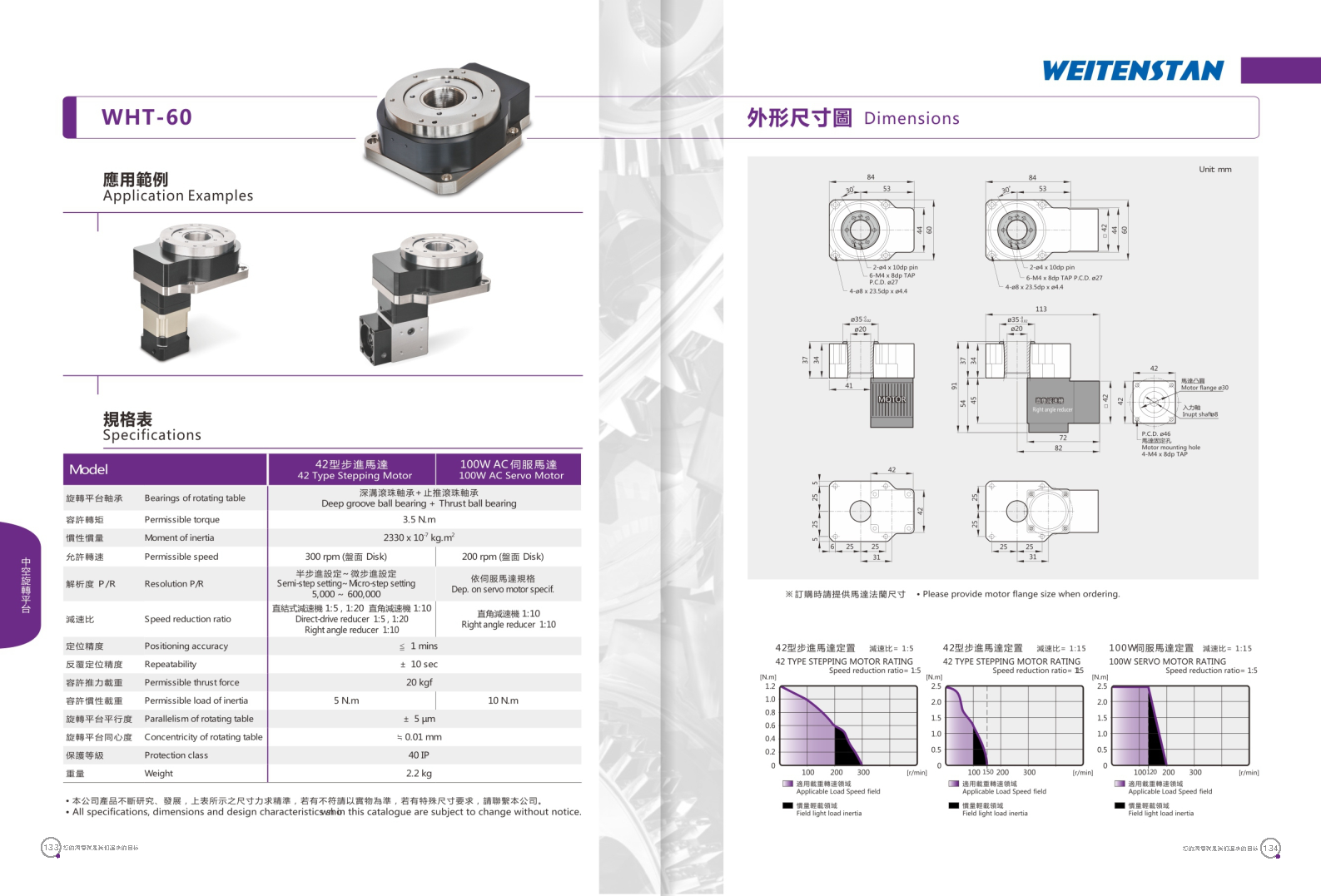 WHT系列中空旋轉平臺。 具有優(yōu)異定位精度與重復精度的中空旋轉平臺,可搭配使用伺服馬達或步進馬達,展現(xiàn)獨特的性能可靠度。 工作物可直接鎖固。旋轉盤面可直接鎖固工作物,提升工件裝載之方便性。 配線方便。此旋轉平臺為中空式設計,無論是配線或配管均方便。 高精度。定位精度小于1分。重復精度可達±5秒。 運轉動作平穩(wěn)。盤面轉動平穩(wěn),順暢,且定位快速。 適用各種馬達。中空旋轉平臺可采用各種廠牌之伺服馬達或步進馬達驅動。