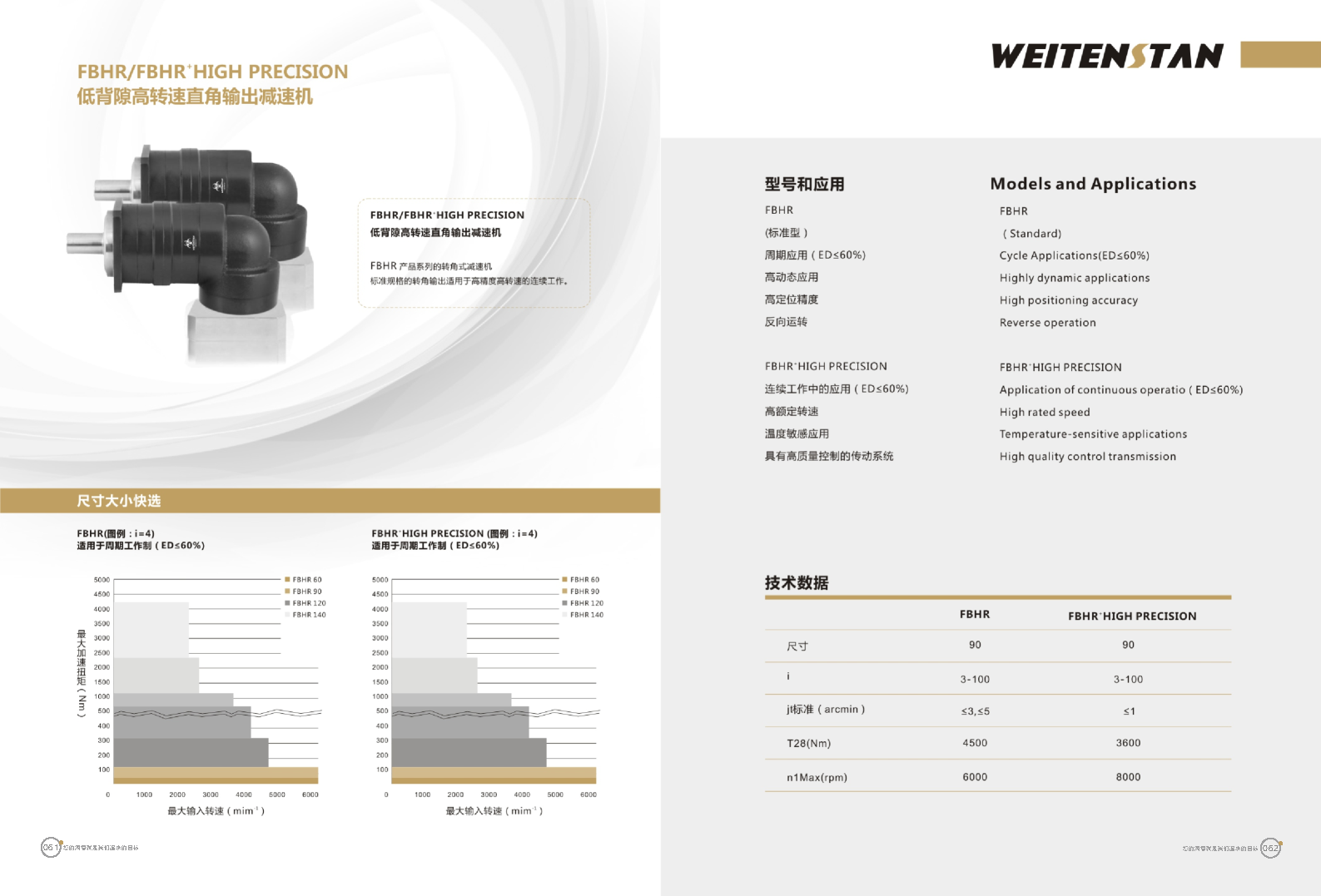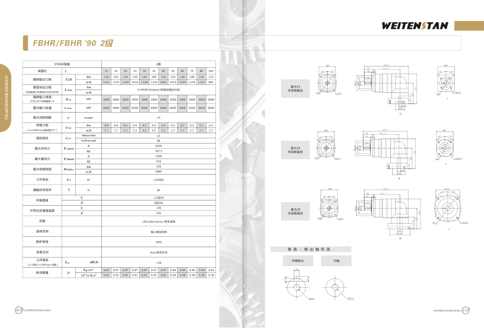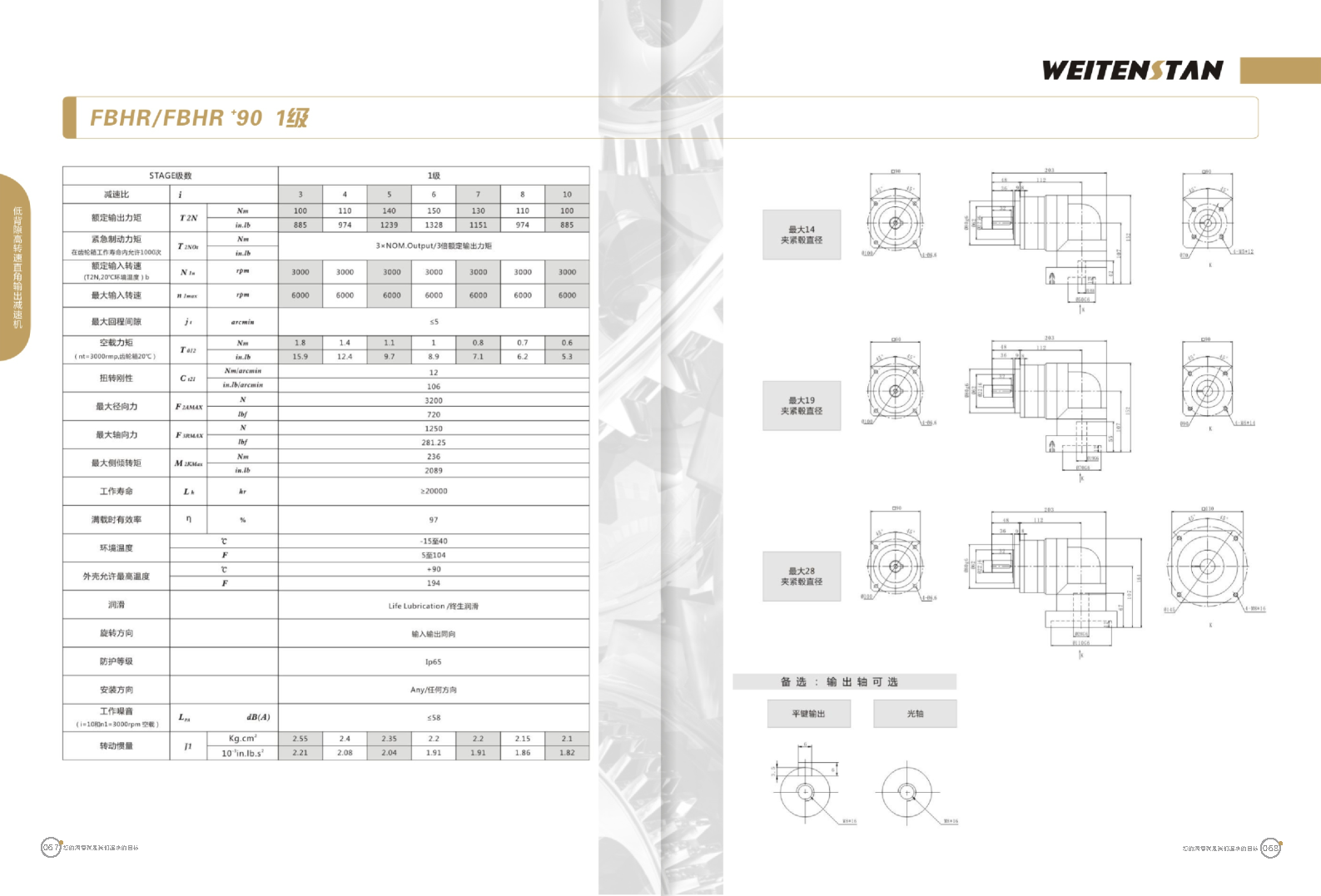 FBHR系列低背隙高轉(zhuǎn)速直角輸出減速機(jī)。 FBHR產(chǎn)品系列的轉(zhuǎn)角式減速機(jī),標(biāo)準(zhǔn)規(guī)格的轉(zhuǎn)角輸出適用于高精度高轉(zhuǎn)速的連續(xù)工作。 極高的功率密度。盡管以往系列性能極為出色,但我們成功的將扭矩提高了近40%。不斷提高極限值,典型威騰斯坦產(chǎn)品! 電機(jī)安裝簡(jiǎn)易。電機(jī)可安全簡(jiǎn)易的一步安裝,另外您也可以選擇威騰斯坦享有的專利權(quán)的,帶有長(zhǎng)度補(bǔ)償軸的安裝。 任意位置安裝。不管你在哪個(gè)位置安裝,你的齒輪箱始終有相同的潤(rùn)滑油/潤(rùn)滑脂量。安裝靈活、齒輪箱能夠垂直、水平、與從動(dòng)軸一起向上或向下安裝。 極高的定位精度。根據(jù)用戶需求,你可獲得回程間隙小于角分的高型行星齒輪箱。這也大大提高了你應(yīng)用上的定位精度。 通過(guò)齒輪嚙合,運(yùn)轉(zhuǎn)平穩(wěn)。相比直齒嚙合齒輪箱,本公司的斜齒嚙合齒輪箱運(yùn)轉(zhuǎn)噪音減低了50dB-A,你深知50dB-A所創(chuàng)造的價(jià)值遠(yuǎn)遠(yuǎn)高于70dB-A。此外還有:不再感動(dòng)振動(dòng),運(yùn)轉(zhuǎn)平穩(wěn)到令人驚訝。 世界水平的預(yù)期壽命。原材料進(jìn)行了優(yōu)化,幾何形狀同樣進(jìn)行了優(yōu)化。