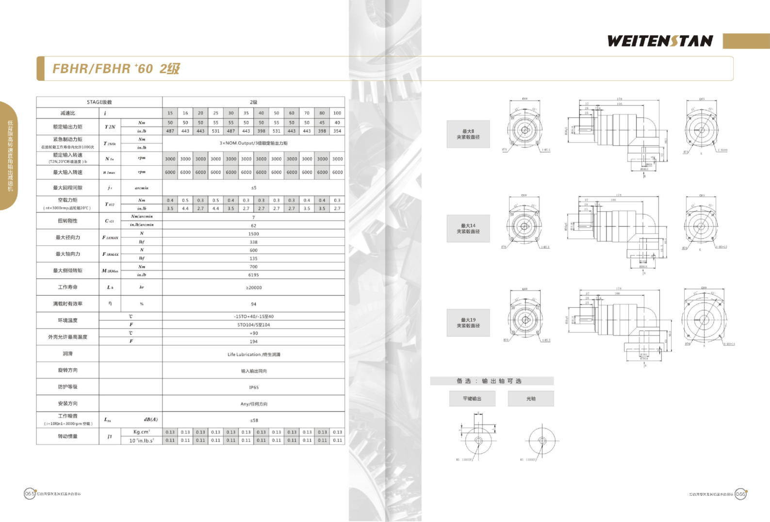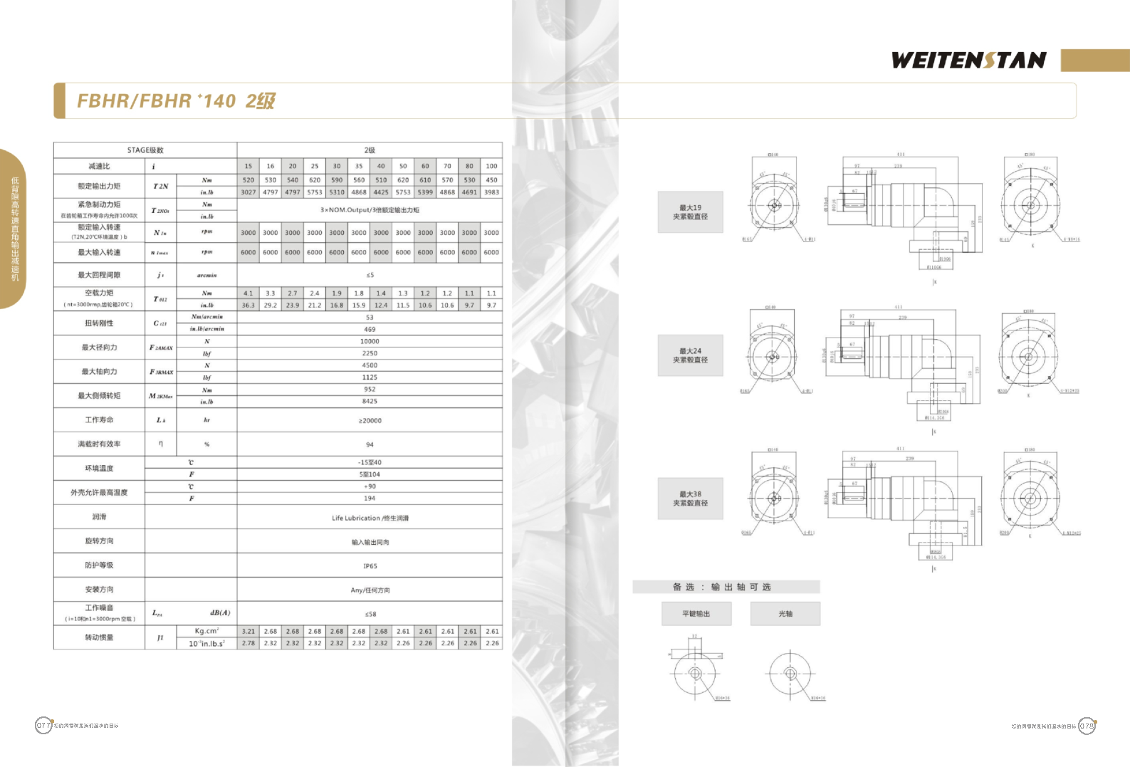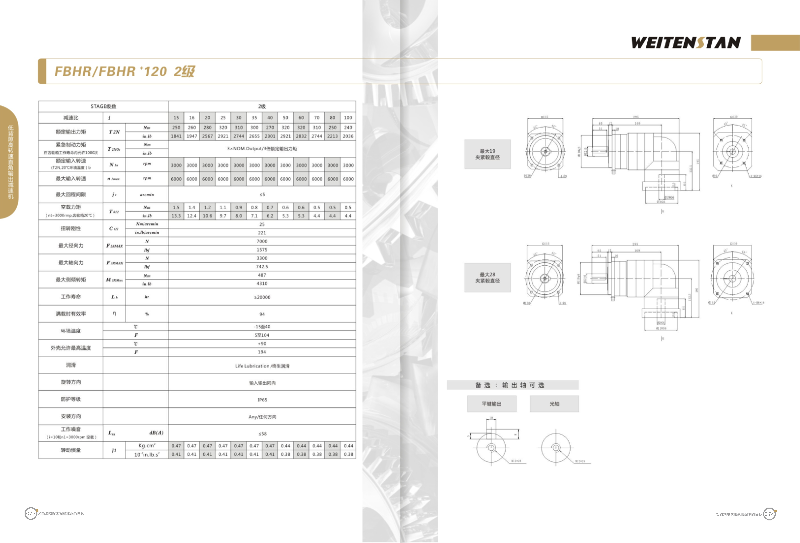 FBHR系列低背隙高轉(zhuǎn)速直角輸出減速機(jī)。 FBHR產(chǎn)品系列的轉(zhuǎn)角式減速機(jī),標(biāo)準(zhǔn)規(guī)格的轉(zhuǎn)角輸出適用于高精度高轉(zhuǎn)速的連續(xù)工作。 極高的功率密度。盡管以往系列性能極為出色,但我們成功的將扭矩提高了近40%。不斷提高極限值,典型威騰斯坦產(chǎn)品! 電機(jī)安裝簡(jiǎn)易。電機(jī)可安全簡(jiǎn)易的一步安裝,另外您也可以選擇威騰斯坦享有的專利權(quán)的,帶有長(zhǎng)度補(bǔ)償軸的安裝。 任意位置安裝。不管你在哪個(gè)位置安裝,你的齒輪箱始終有相同的潤(rùn)滑油/潤(rùn)滑脂量。安裝靈活、齒輪箱能夠垂直、水平、與從動(dòng)軸一起向上或向下安裝。 極高的定位精度。根據(jù)用戶需求,你可獲得回程間隙小于角分的高型行星齒輪箱。這也大大提高了你應(yīng)用上的定位精度。 通過(guò)齒輪嚙合,運(yùn)轉(zhuǎn)平穩(wěn)。相比直齒嚙合齒輪箱,本公司的斜齒嚙合齒輪箱運(yùn)轉(zhuǎn)噪音減低了50dB-A,你深知50dB-A所創(chuàng)造的價(jià)值遠(yuǎn)遠(yuǎn)高于70dB-A。此外還有:不再感動(dòng)振動(dòng),運(yùn)轉(zhuǎn)平穩(wěn)到令人驚訝。 世界水平的預(yù)期壽命。原材料進(jìn)行了優(yōu)化,幾何形狀同樣進(jìn)行了優(yōu)化。